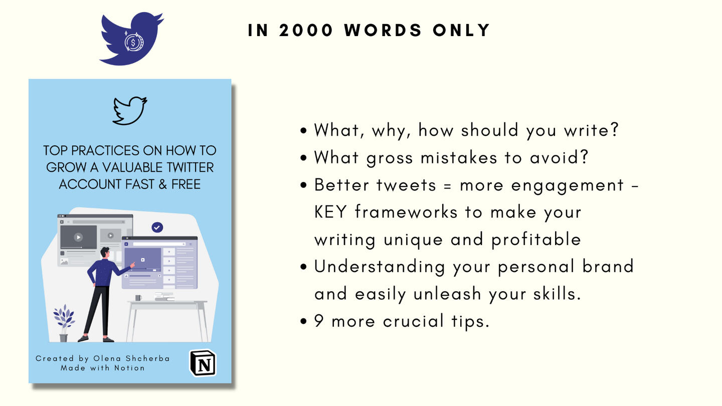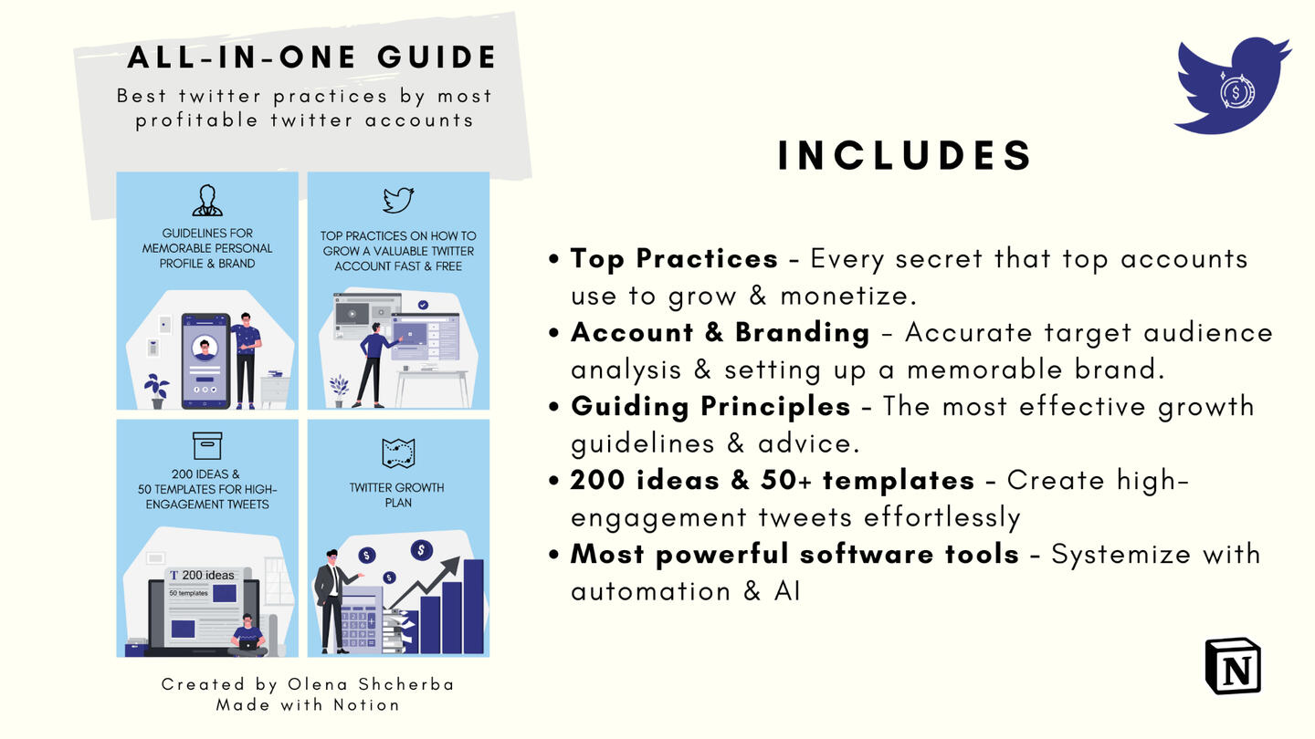 This constantly updating guide will show you various ways on how top Twitter accounts leverage Twitter- It contains all current best practices and freshly developed schemes on how to grow on Twitter & monetize - Never waste money on another guide/course again.